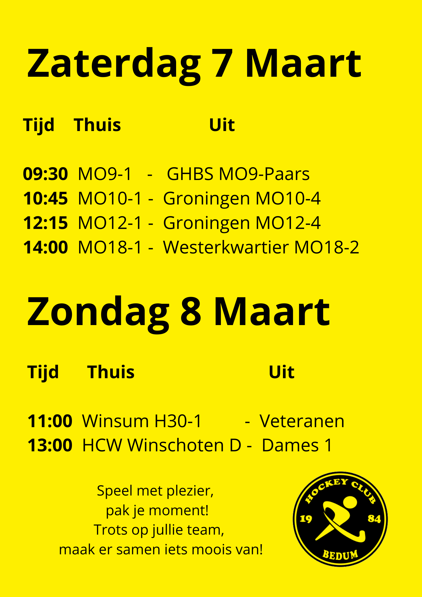 Op zaterdag 7 maart is het een gezellige thuisdag voor de MO8, MO10, MO12 en MO18.